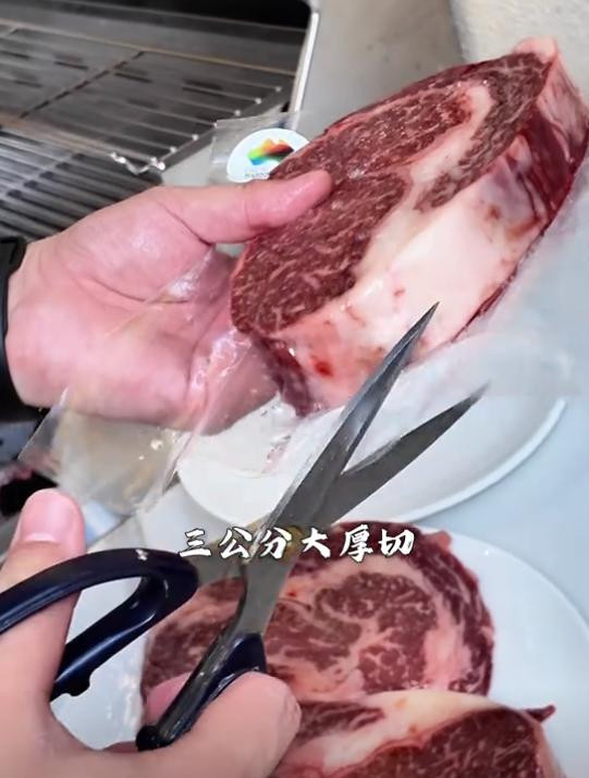 光是这一盘螃蟹肯定吃不饱,于是曹云金又去冰箱里拿出来三块战斧牛排,这牛排足足有3公分厚,看上去十分饱满,而且还是非常极品的雪花牛,看着就让人口水直流。