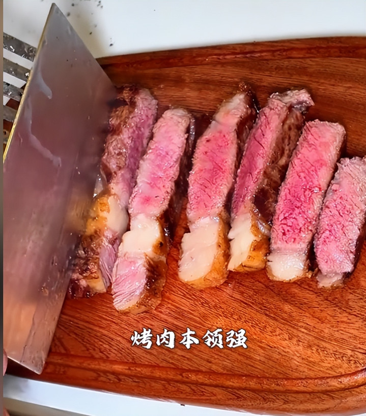不得不说,曹云金这烤肉水平还是很厉害的,他烤出来的牛排很嫩,从切开的侧面来看,牛排中心还有一些淡淡的红色,说明这牛排烤的非常到位。